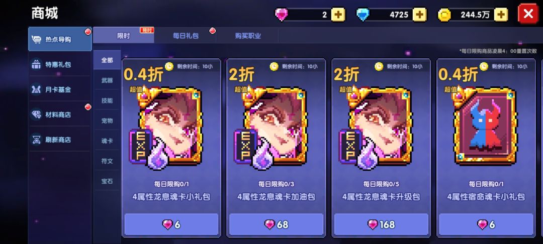 6粉钻四属性的魂卡,特别是这个龙息哦因为有冷却,攻强,百分百攻强,好的概率很高可以买。比买10几张砖石的不出胚子要良心很多