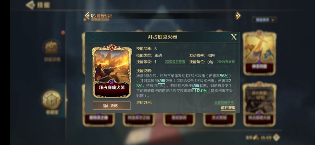 ④技能进阶【拜占庭喷火器】本身伤害高,同时其增益buff也很强,能大大增强爆发。这个可以说是最好的一张卡了,又有足够的伤害又可以给队伍增加buff,很容易打出高额伤害配合其他技能秒人,从而达到多打少。【坎尼攻势】可以选择带,这个可以让对面有眩晕效果,多了一个控制。让工具人当得更加彻底,为关羽提供更加良好的输出环境。