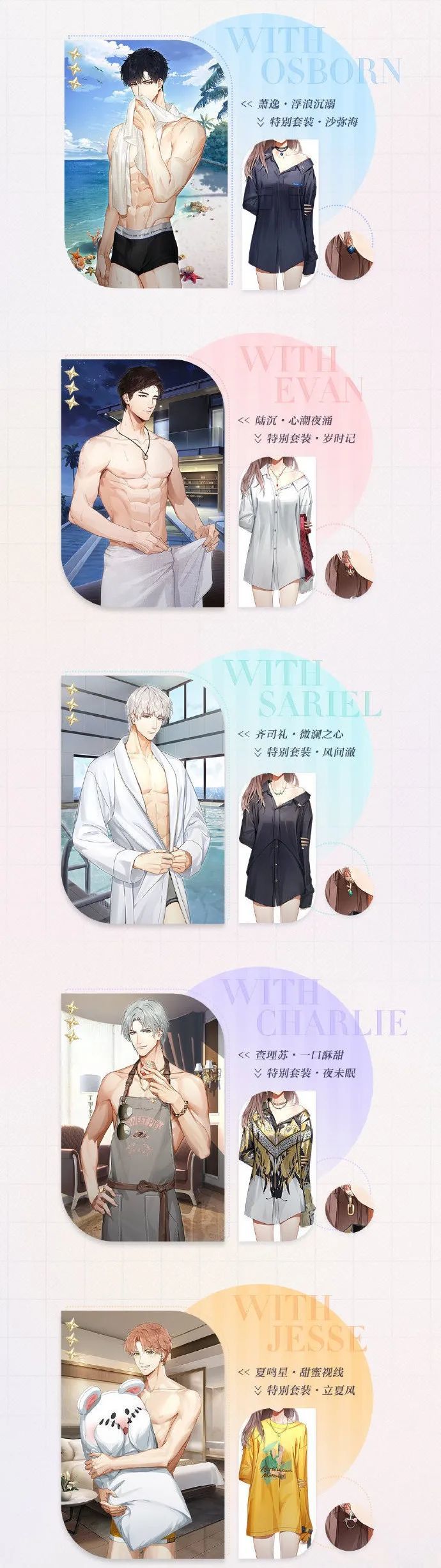 《光与夜之恋》本周公布了一套夏日风格限定三星灵犀,评论区的姐妹们已经开始把持不住了,不过查理苏的画风好像跟别人有点不一样……