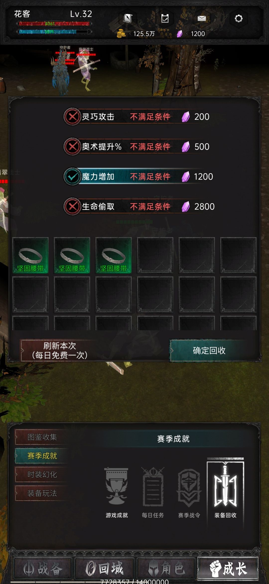 首先装备回收在32级开启,在成长——赛季成就里