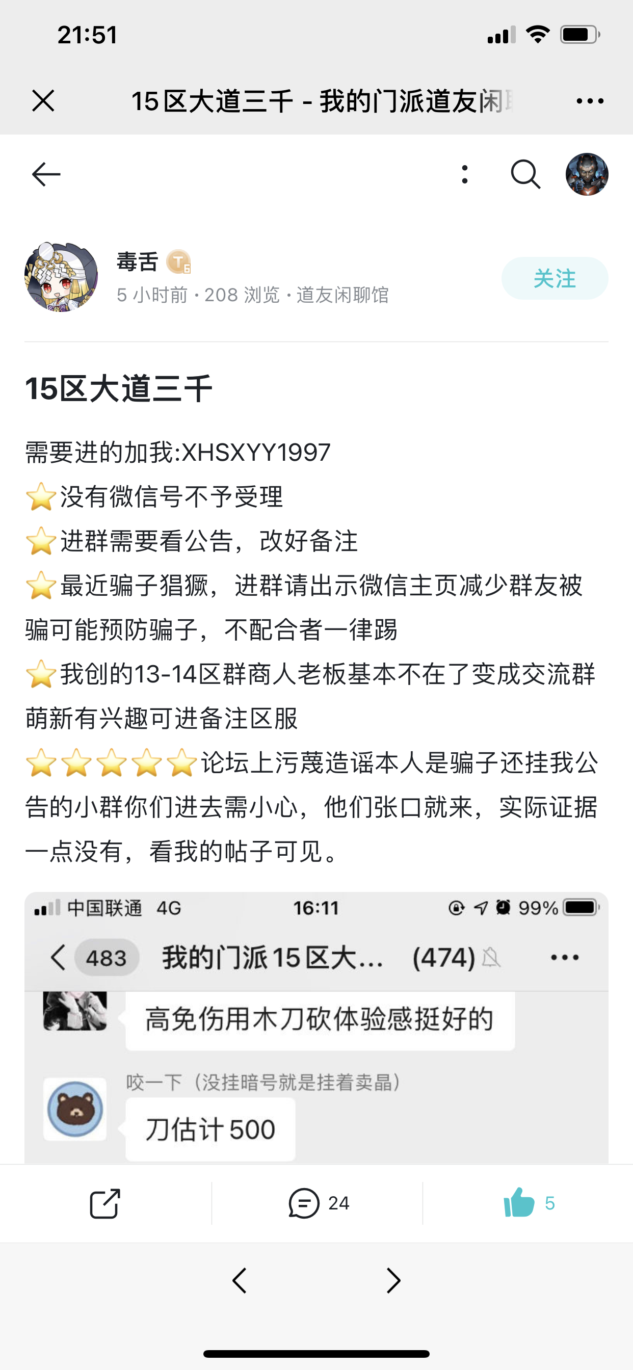 本来也不想说什么,只不过看不惯一个过街老鼠,就给大家曝光曝光这个 12 13 14区人人喊打的0氪大佬控物价控仙晶的嘴脸,哦对了还有最厉害的卖群!自己微信小号目测估计5个以上,自导自演很厉害的,各位萌新瑟瑟发抖了吧,老板不搭理这比就把人踢了,还铮铮有词为大家服务,天天活跃在论坛为自己洗白,整几个小号在装腔作势