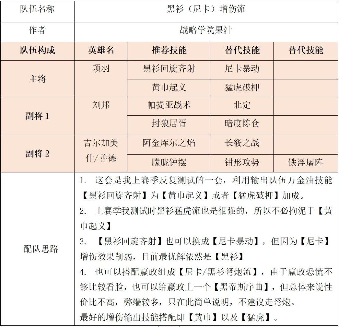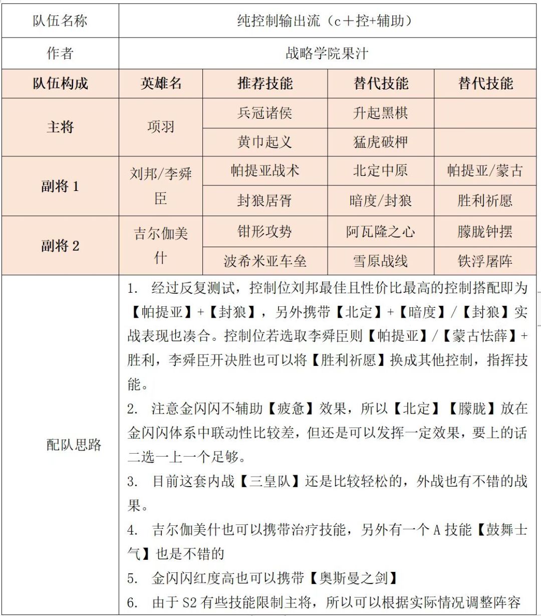 项羽在S1中前期作为平民神奇,深受玩家喜欢,后期由于受净化被克制严重难以发挥。在S2推出新的输出技能以及新英雄吉尔伽美什后,项羽队虽不能达到顶配强度,但还是有一战之力的。接下来将项羽阵容分为【纯控制输出流】【控制恐慌流】【黑衫增伤流】【尼卡增伤流】