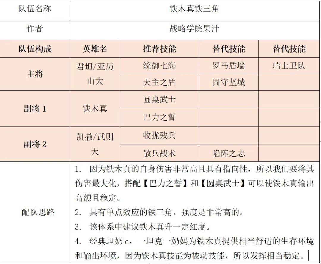 没想到吧,集火队万年辅助铁木真也能当主c,其实铁木真作为输出的阵容强度相当高,由于铁木真自身技能缘故,其高额的伤害还附带单点和破甲效果。接下来讲解的是内测时我们几位导师一起研究的【铁木真铁三角】