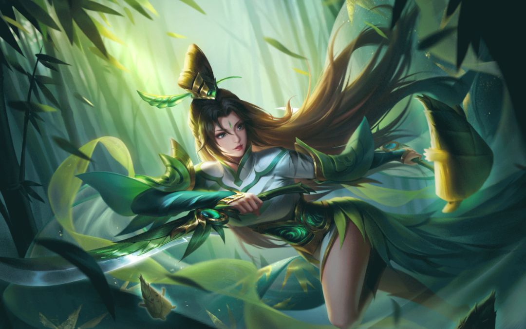 貂蝉此次的全新换装,赋予其水岭青卿的身份,绝美出尘的侠女,以竹叶为裳、竹芽为角,又以竹叶作剑,斩断过往爱恨,而后决意历遍山河,录天下见闻于《水岭注》中,她以竹叶之曲为载体,记录世间幸福美好的事物,为《水岭注》增添一抹动人的色彩。