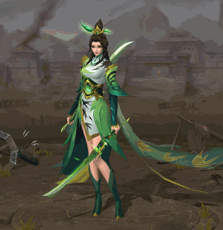 在设计过程中,延续了该系列的武侠风格,服装剪裁与人物形貌皆体现了武侠的侠气与潇洒,又选取了颇有武侠气息的竹叶与竹芽,来作为貂蝉换装的主要元素——竹芽清新可爱,好似女子的灵动,竹叶锋利如刀,便是女子的侠情。