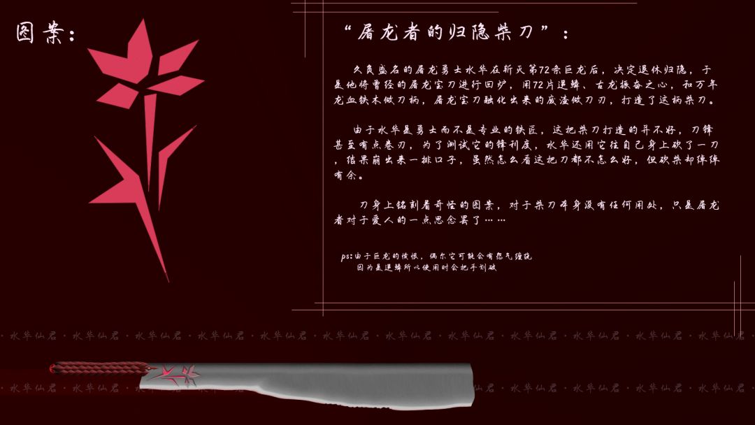久负盛名的屠龙勇士水华在斩灭第72条巨龙后,决定退休归隐,于是他将曾经的屠龙宝刀进行回炉,用72片逆鳞、古龙振奋之心,和万年龙血铁木做刀柄,屠龙宝刀融化出来的废渣做刀刃,打造了这柄柴刀。