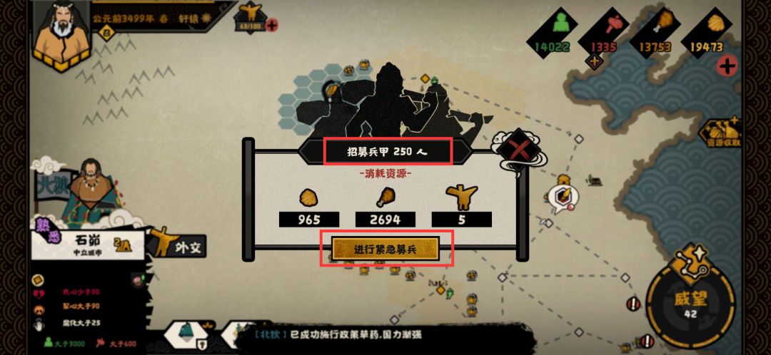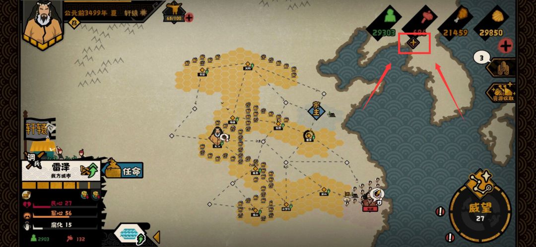 1.选择轩辕开局,在地图中央方便同时向他国扩张