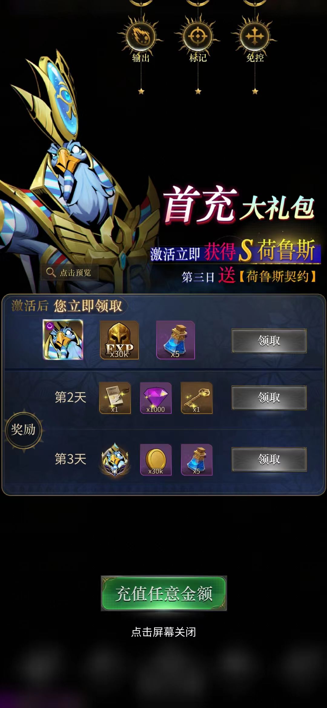 除此之外,钻石、金币、时间药水都是前期快速发育的关键,购买第三天还能获得荷鲁斯契约,不多说,这个一定要买!