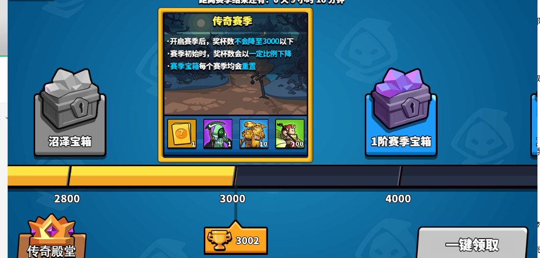 3、传奇赛季或者首充首充小楼在这里我门就不多说了,传奇实际当我们的奖杯数量达到3000时,我们可以随机开出金色英雄,当然开出来的英雄都是随机的。