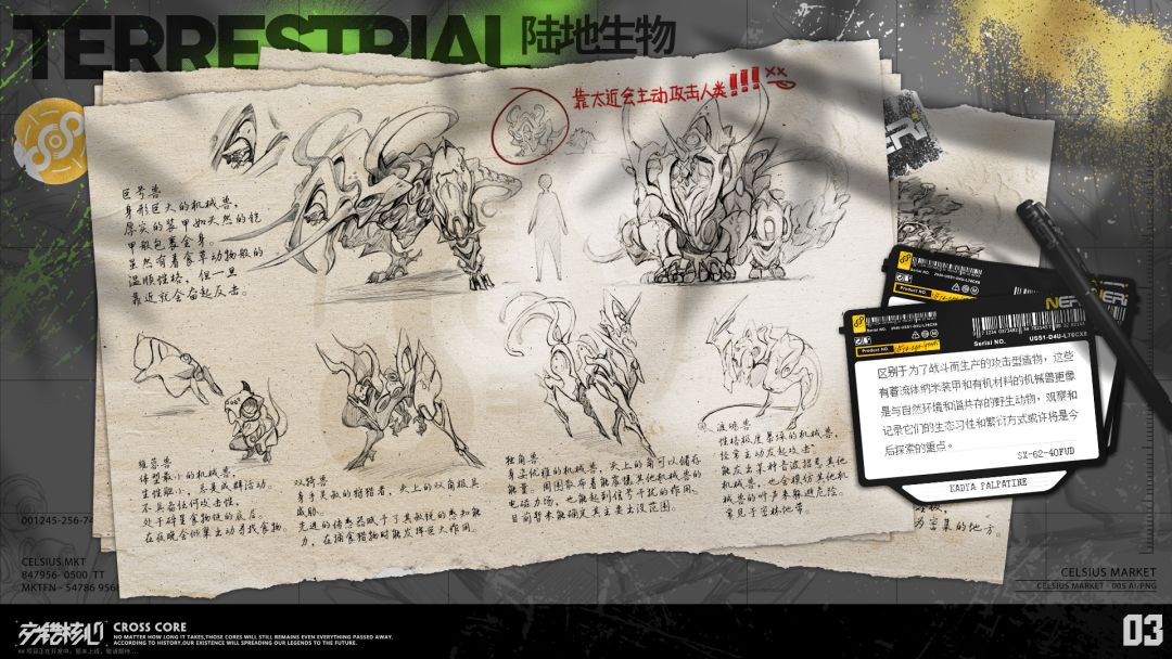 除了植物与果实,碎星上也生活着各种攻击型造物。这些造物全身覆盖着机械装甲,但他们的生态习性与生活方式,和普通的地球野生生物无异,我们更愿意称它们为“碎星野生动物”。这一段时间的研究将会着重观察这些陆地生物。 —— 碎星生态报告Ⅲ