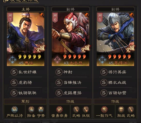 总结:大量的实战可以看出,这个队伍凭借着太史慈比较稳定的输出以及破除被动指挥的能力,基本上很多主流队伍都很容易乱杀,剩下的就是看夏侯渊的输出爆发伤害了!这个队伍其实对于太史慈的红度要求没那么高,夏侯渊还是主要输出,并且也不怕箕形阵的针对,非常适合官渡曹操2+1的玩法哦!