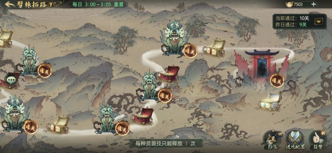 先把各种日常活动介绍一下。斗兽选右边四个都是boss,用武器技和灵兽技能搭配过图。合理释放技能可以缩短时间。