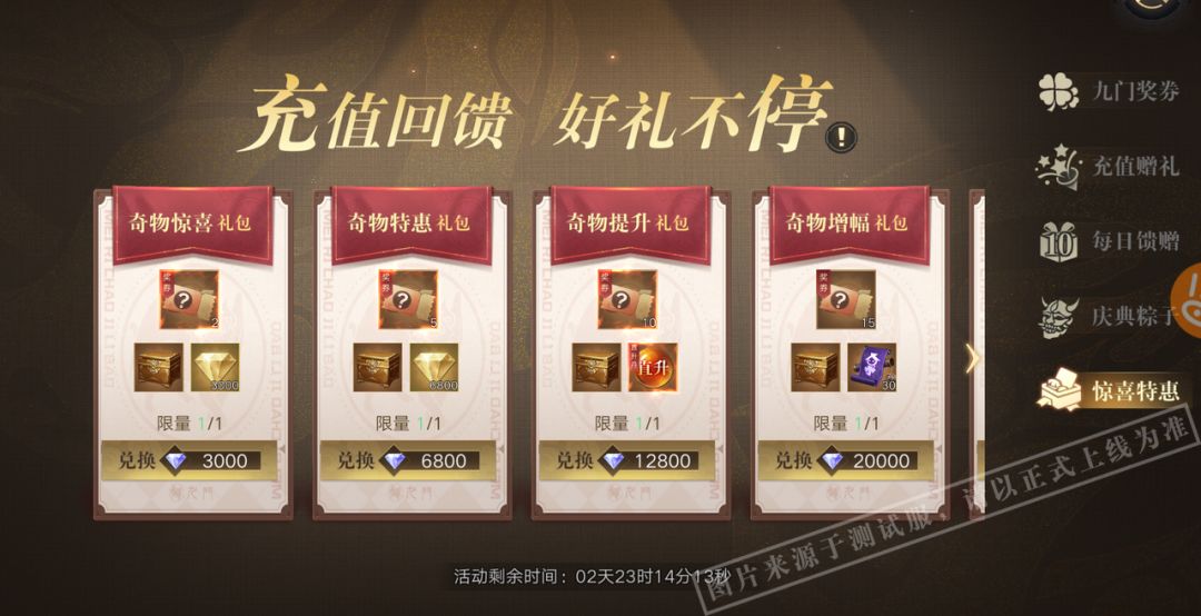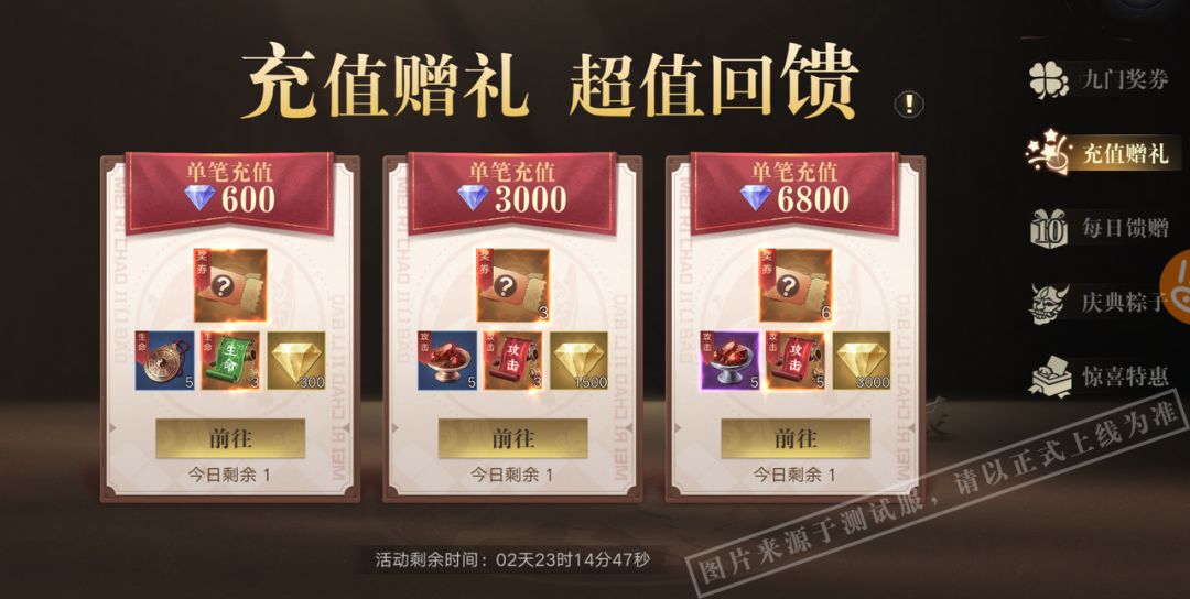 活动期间限时开启,共有600、3000、6800三个档位,充值各档位对应蓝钻,将获得对应的额外材料和九门奖券!*每天每个档位限一次,档位奖励无法叠加,充值某档位只可获得该档位对应奖励,无法获得前置档位的奖励。