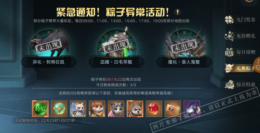 活动期间,每日的9:00、11:00、13:00、15:00、17:00、19:00,将会在尸洞、镖子岭、石道迷宫、后山中的随机3个地点将出现异常活动的粽子。异常活动的粽子在出现后的30分钟离开。玩家每日有3次击败活动粽子获得奖励的机会。