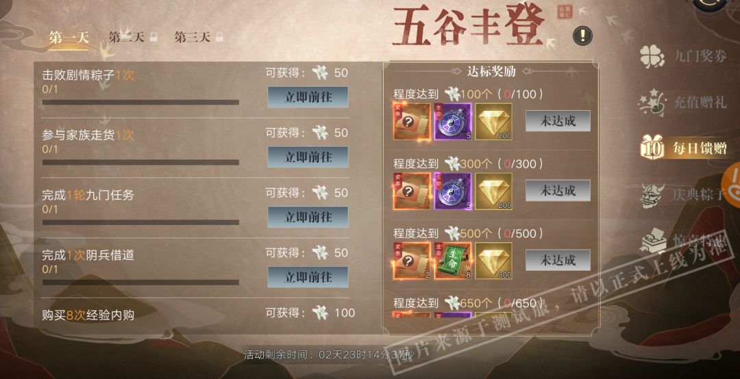 活动期间每日完成指定任务玩法即可获取积分,积分达到指定目标后即可领取九门奖券、奇物材料以及金钻!