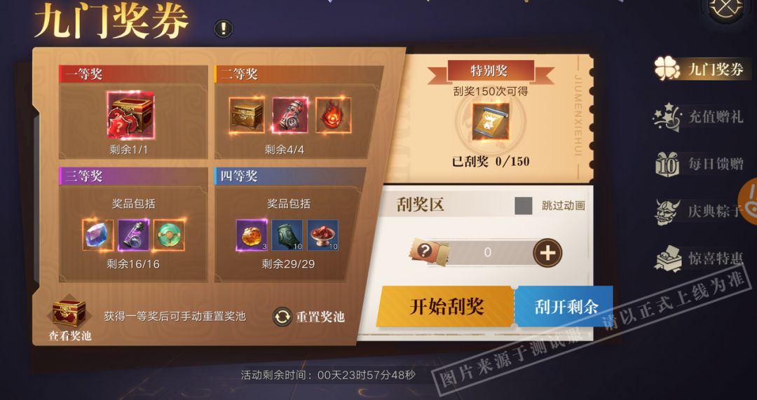 活动期间,玩家通过使用九门奖券进行刮奖,可在一、二、三、四等奖奖池中随机获得一件奖品。每轮奖池中共计有50件奖品,抽取后将从奖池中移除。