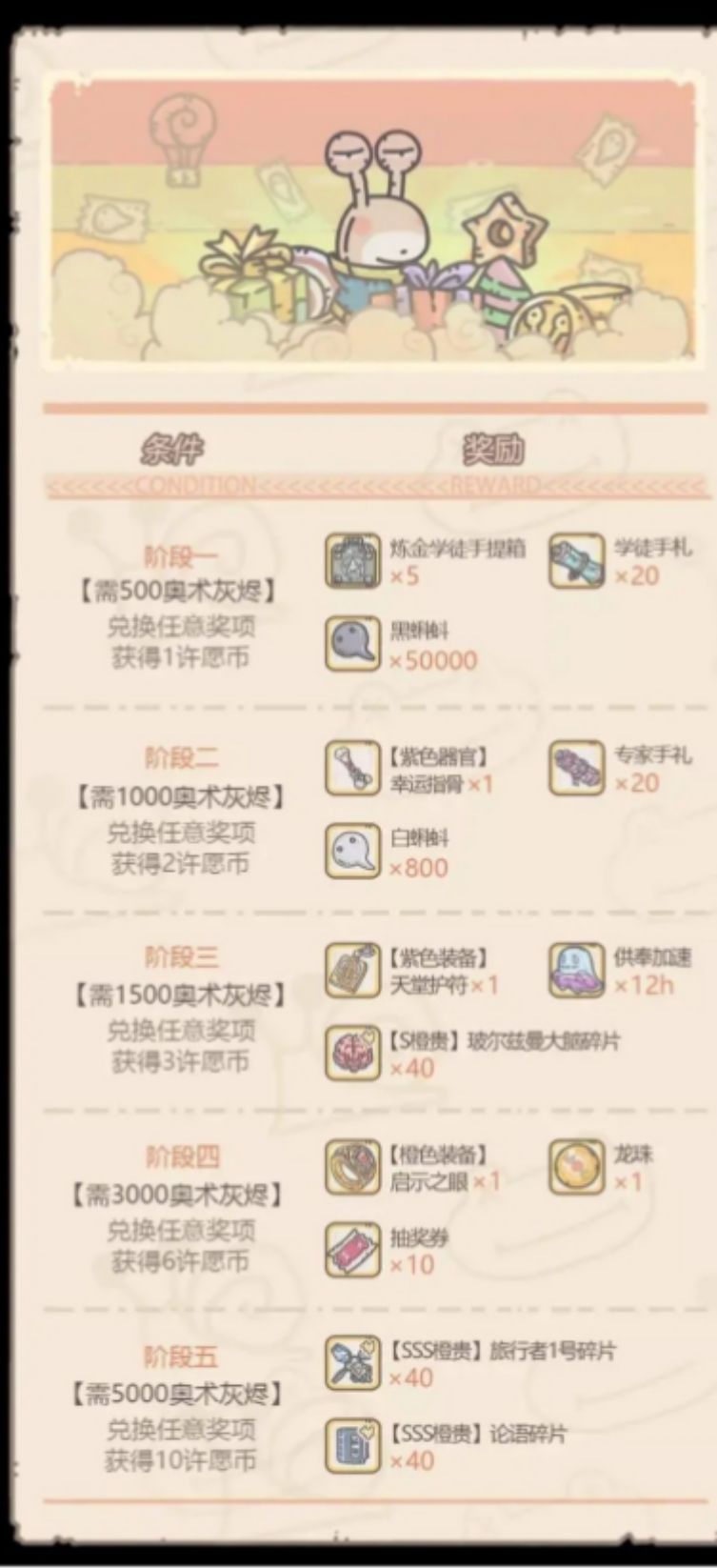 基本上和气球没太大区别,也是第一项需要长时间囤积物资,第2项在抽奖周后基本上没问题,第3项平时也不会怎么用,应该不会缺。45两个依旧白给。然后排除撒币可以多轮获取,现有灰烬总数仍为3600。说到这里,大家都发现了,和气球的数量一模一样,所以操作的方式和抽奖周也是一模一样。如果追求保底SSS橙贵撒币80次OK;如果追求活动物资4档,你需要撒币180次(仍然是两轮加积分2档)。