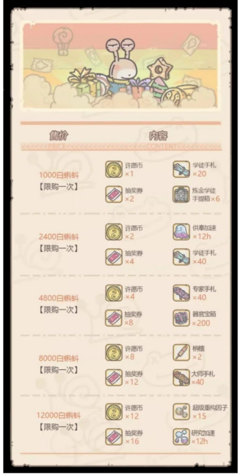 许愿周还有个限时白蝌蚪礼包(1000-12000白蝌蚪),因为与灰烬完全无关,不属于活动物资的囤积,就没太关注。直接上图。稍微啰嗦一句就是,个人感觉就第一个和最后一个礼包最划算,第二个也还行,毕竟可以为供奉周做准备,至于怎么买,看大家喜好吧。