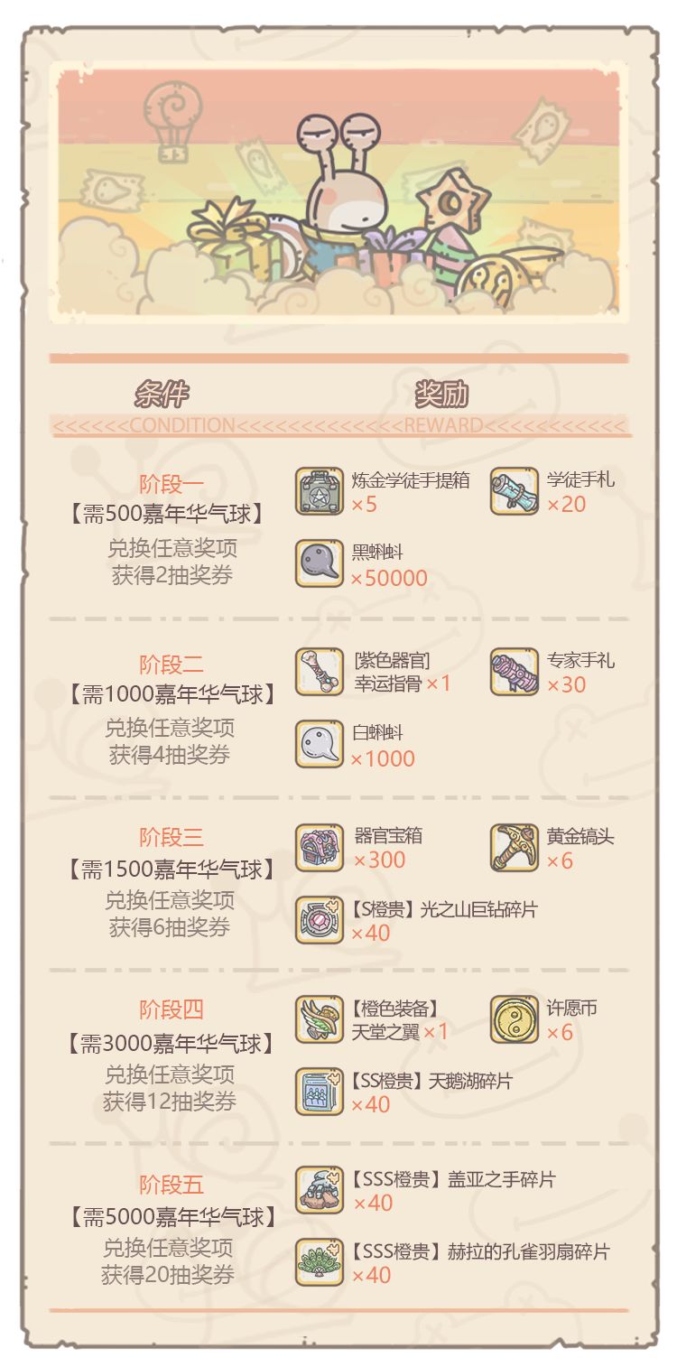 此图是气球奖励图(注意此处奖励区别于上述的积分奖励!),在获取到对应的气球数量以后,可以选择性购买相关奖励,在购买了前一档任一奖励后才能购买后一档奖励。举个栗子,你有3000气球,你想买阶段三的橙贵,就必须阶段一买一个,阶段二买一个。如果你买了两个阶段一,阶段三的气球就不够了。此处特别提醒:各阶段的物资可能每次活动会有变化,特别是阶段四的合成装备,所以建议阶段四有启示之眼的时候才发动。至于为什么要有启示之眼才发动,因为这玩意是红装必须的合成装备,巨缺!关于多余的气球,也不用担心,虽然不会累计到下一次活动,但是会折换成黑蝌蚪,具体折换比例恕我暂时没找到。