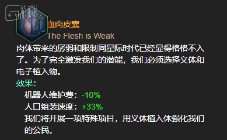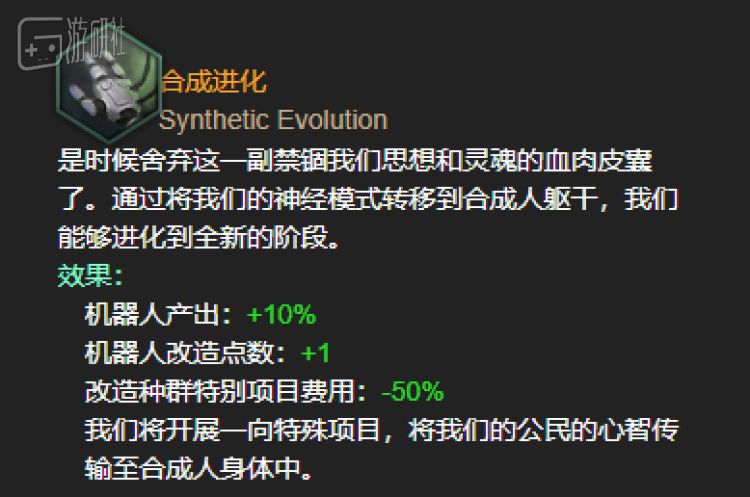 机械进化是当玩家掌握了一定程度的机器人技术后即可专注的飞升路线,可以选择将生物体和合成人完美融合在一起。