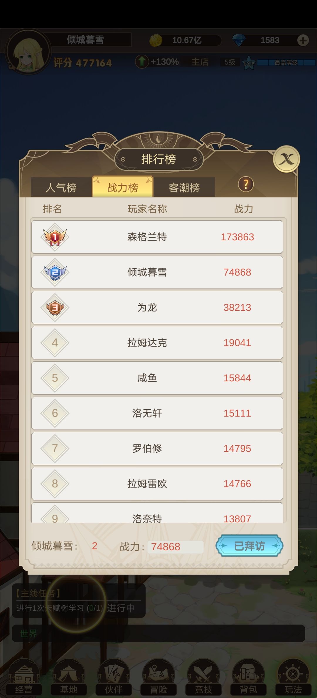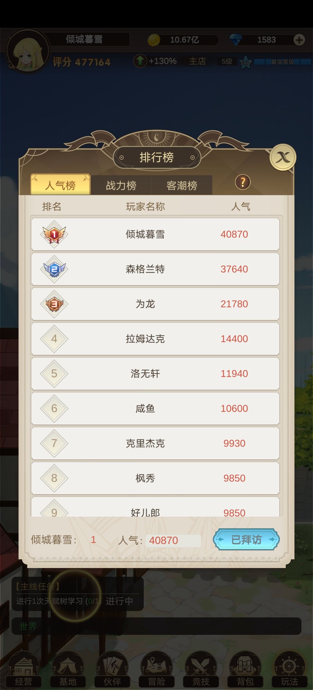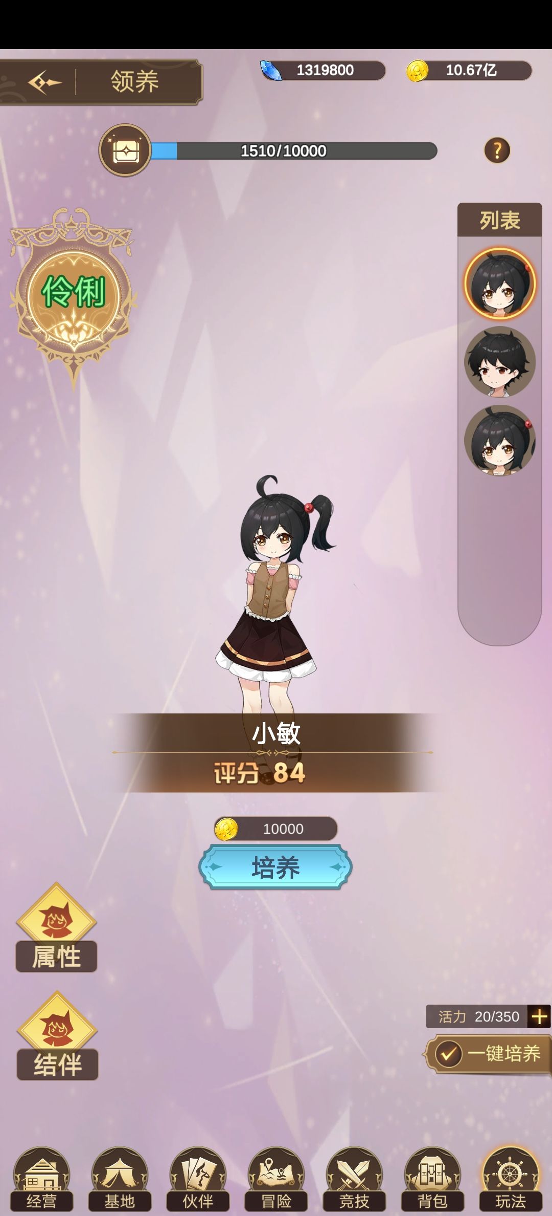 以上这些差不多能让新人玩懂这个游戏了,还有一个我没有说,目前伙伴战力不是看品质的,有的品质低加的战力最高,这些我就不一一说了,你们自己体会,伙伴亲密越高生的小孩品质越高,加的战力越高,恢复培养小孩的药水也要买,不写了要干活了,你们慢