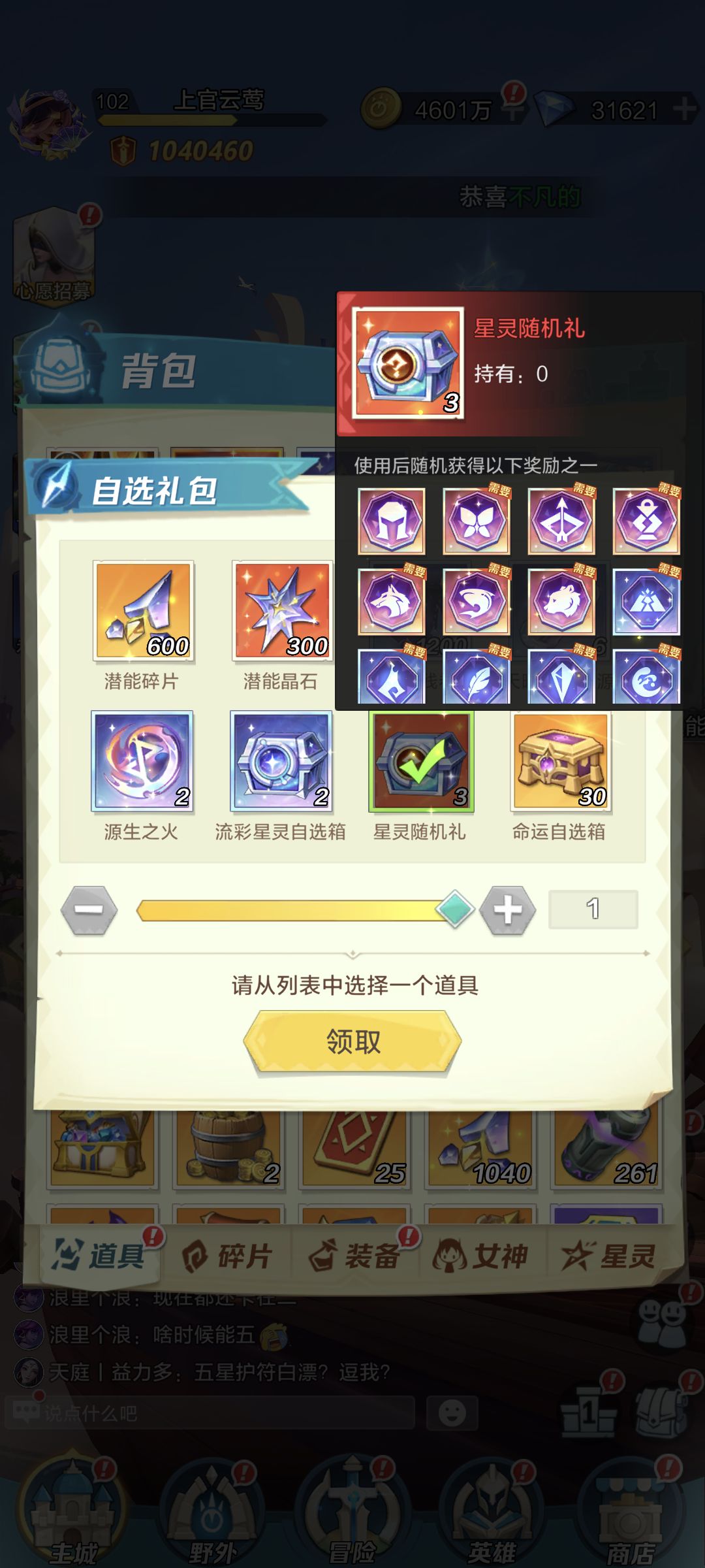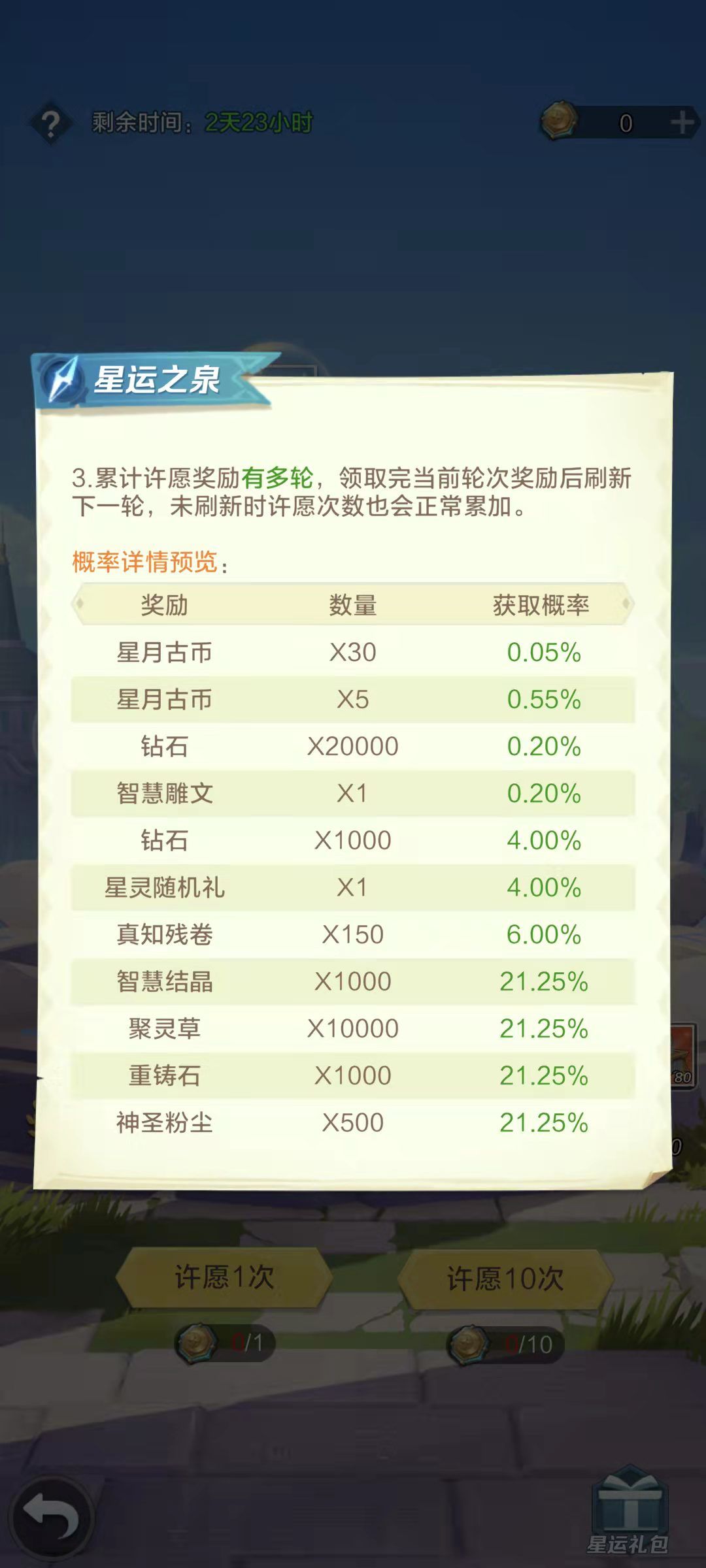 出货概率也调整了一下,拿走了潜能碎片这个垃圾,概率平分成1000钻和1个星灵随机礼。