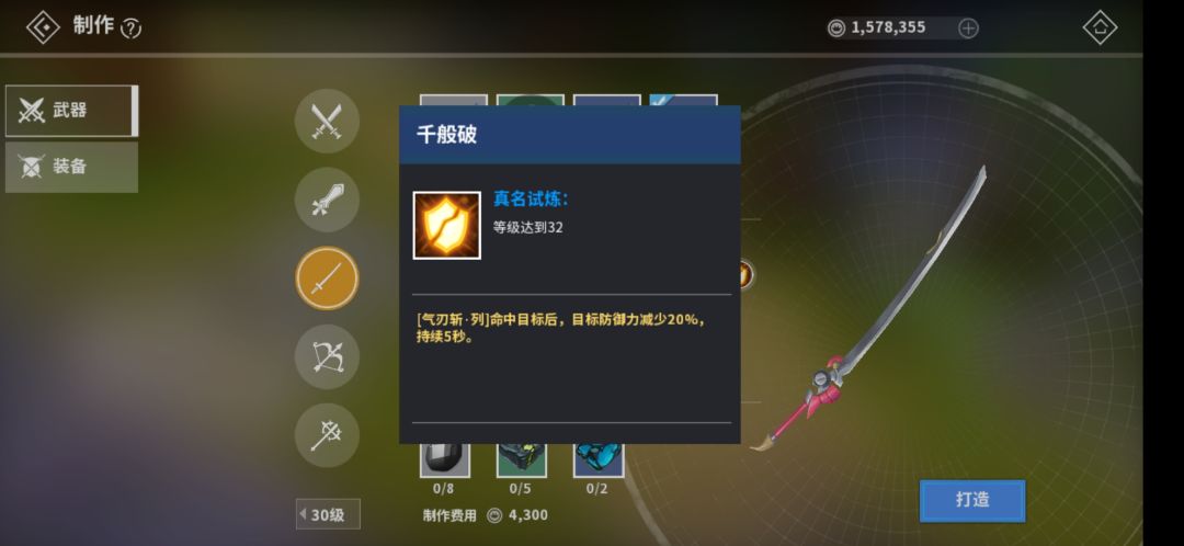 (但其实30级材料可以考虑造一把【赤色绝影】、一杆【先锋长枪】,前者可以在打公会boss“鲲”的时候降低boss防御,帮助队伍快速攻略,后者是“艾布纳”100好感任务需要消耗的材料)