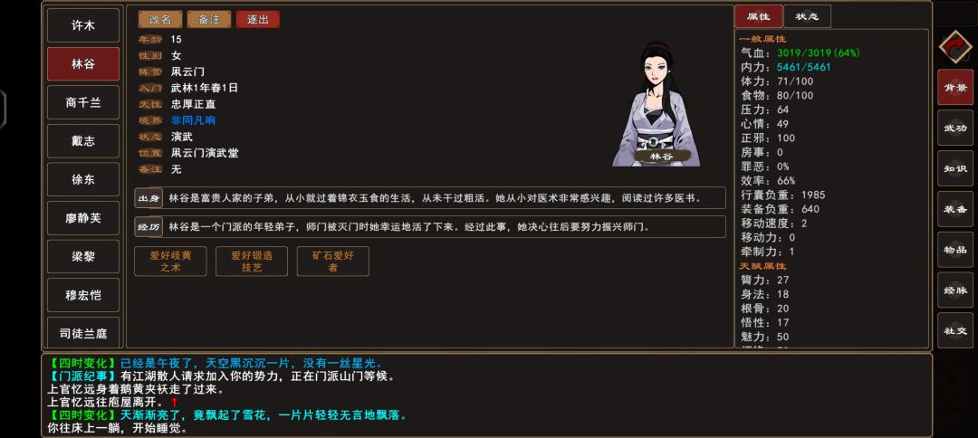 后面这个“穆”是新进个小白脸外门弟子,当过飞贼,魅力区区19点,(我承认除了魅力,他颜值对我这个掌门都有威胁了)但是,19魅力,从我内门大弟子“戴志”(49魅力)手里把另一个内门女弟子抢走了?!另外两个内门弟子匹配成功!