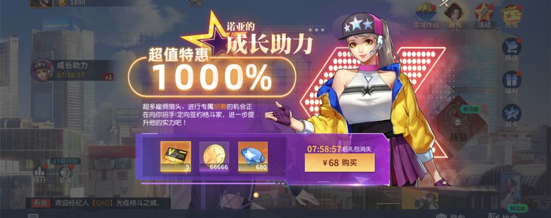 这三个氪金节点可以和下列一些氪金项搭配使用,且建议开局优先完成首充6R进度,因为赠送的不知火舞是一个很均衡强势的格斗家,就算后续养成不当队伍核心也能在前期用来打工过渡