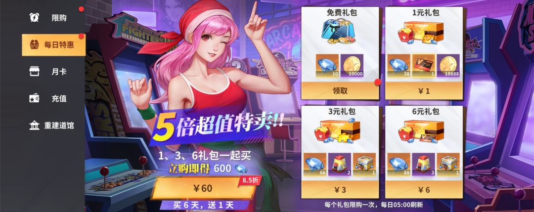 3.每日特惠礼包(1+3+6=10R),打算每天都all in的话可以直接买85折7天打包的,相当于是买6天送1天,这个礼包主要是每天都能领5个体力盒子,而前期加速成长的关键就在于体力,有体力才能做更多的事情,获得足量的资源