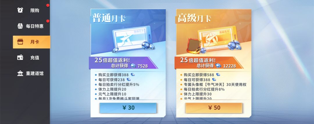 2.两个月卡,小月卡30R=7440钻,大月卡50R=12140钻,两个最好是全都要买,因为除了钻石获得之外还会有其他的一些增益,比如说提升体力上限(这个非常关键),和协会分红提升等