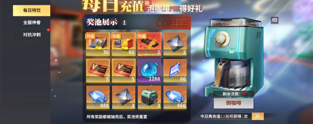 6.每日特饮,每天氪金数量满12就能抽奖,奖池里的东西都很不错,有装备刻印的材料、插件等,当天氪完要记得抽