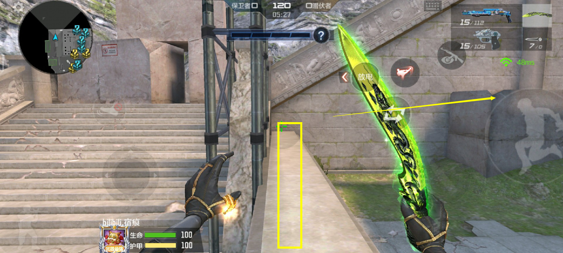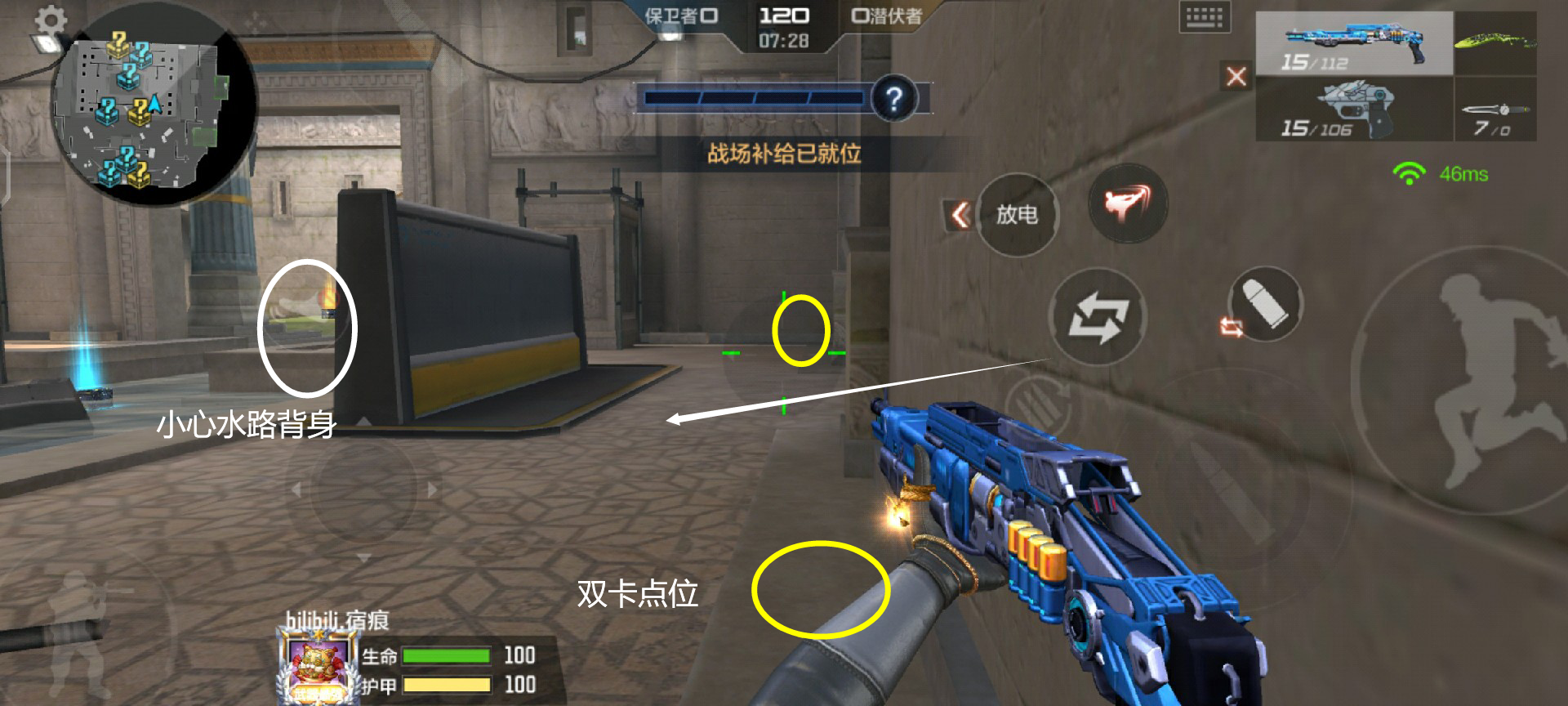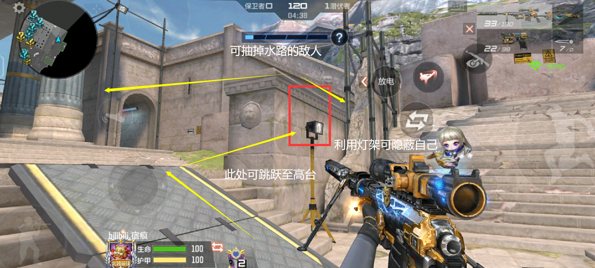 除此之外,小伙伴们还可以通过灯架跳至墙壁边缘,利用水路的柱子来作为掩体,左右移动抽水路的敌人,需要注意的是墙壁边缘此处点位相较于上面灯架的狙点来说更容易暴露,不易久留,在多个敌人发现的情况下很难同时击杀,搭配探测手雷使用更佳。