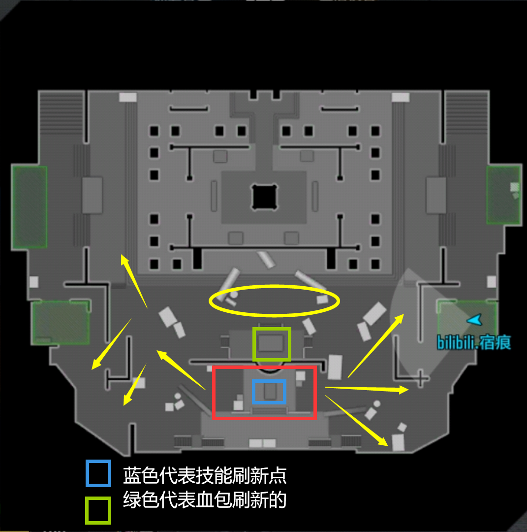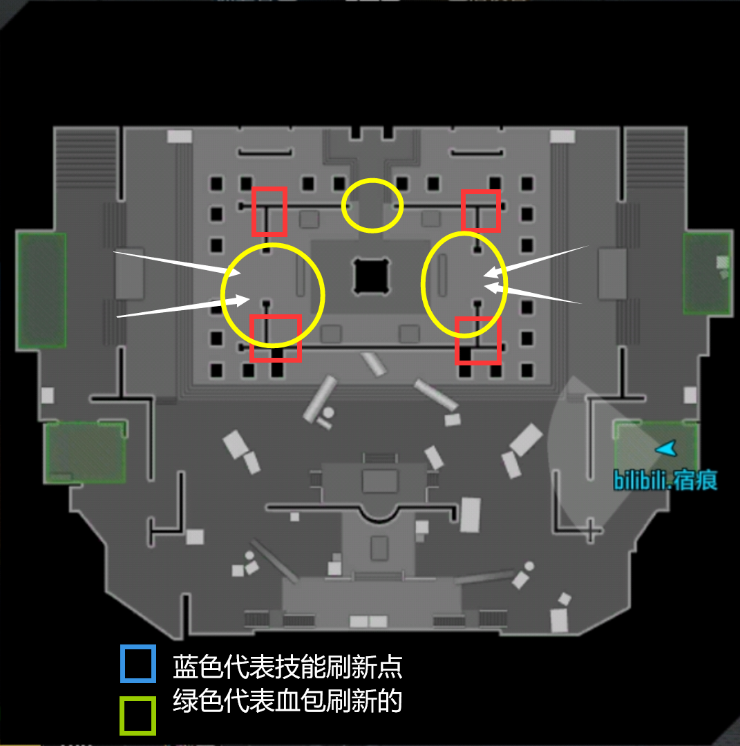 在对局拿下优势的情况下,各位小伙伴们就可以考虑前压对面家前基地了,大厅门后的双卡点则是攻守兼备的一个不错之选。在前顶拿下人头之后,敌方复活必定搜刮前门残像与石柱,当血量不够充足时,即可选择退至此处使用技能恢复状态。
