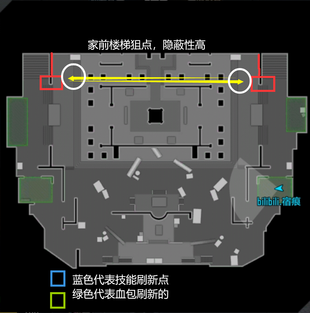 当我们被压家无法探头出去时,就需要使用一招“暗渡陈仓”来打破僵局,潜伏右路保卫左路的小屋就是咱们的一个关键点位。小屋1层为单项通道,里面有金色技能补给箱刷新,使用探测手雷开路找准时机搭配“我先开了”或“暴怒射手”技能前顶敌方家复活点,抓掉复活点口的敌人后可利用门口L型墙壁蹲点单项打敌方前厅门口前的敌人。