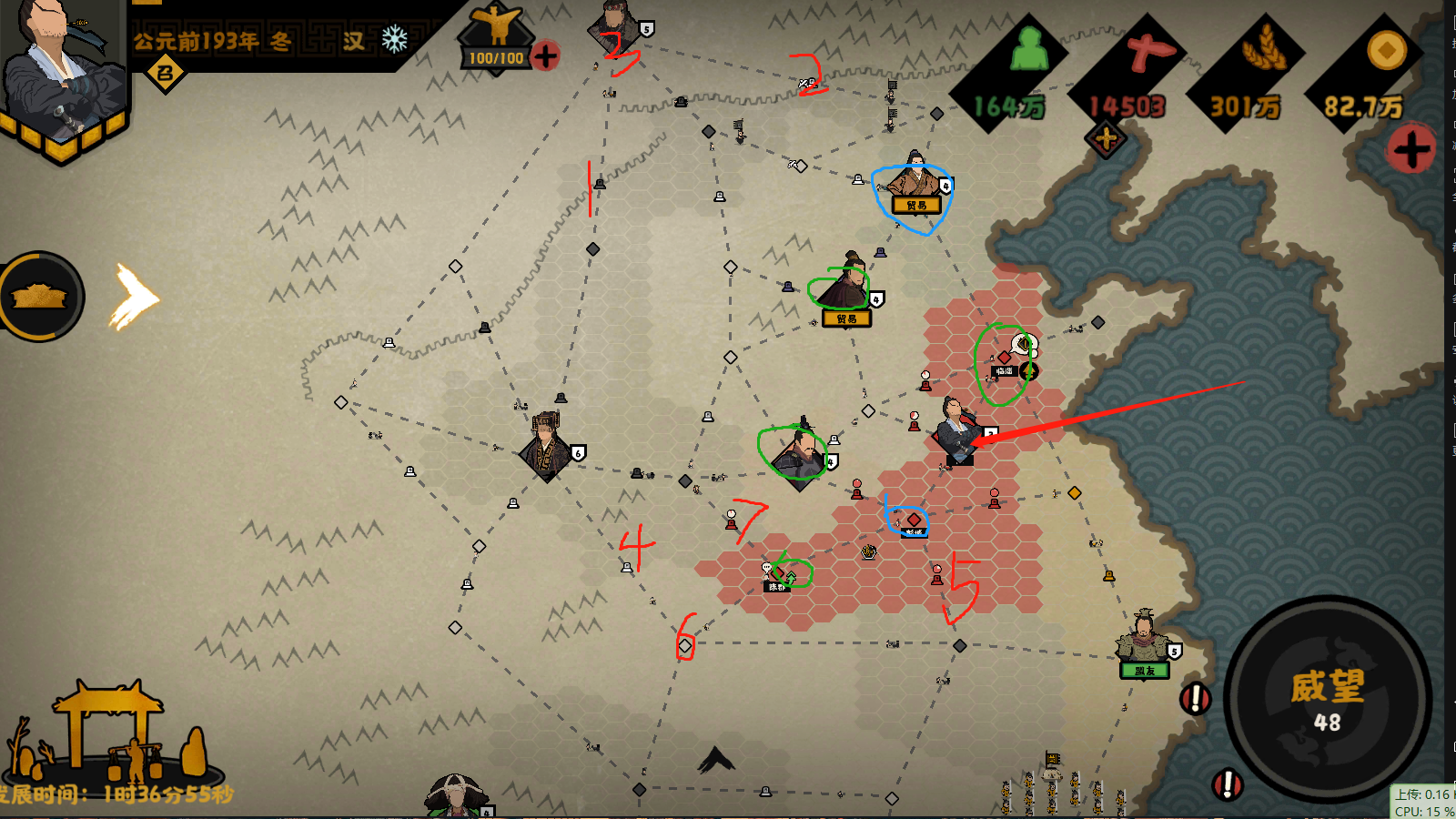 1-7红色直接出发,拿据点,匈奴据点白嫖,其他的打一下拿下两个城市连通兵力,除了阿房宫满兵力别的都是0兵力修缮