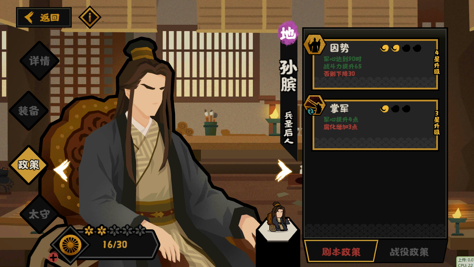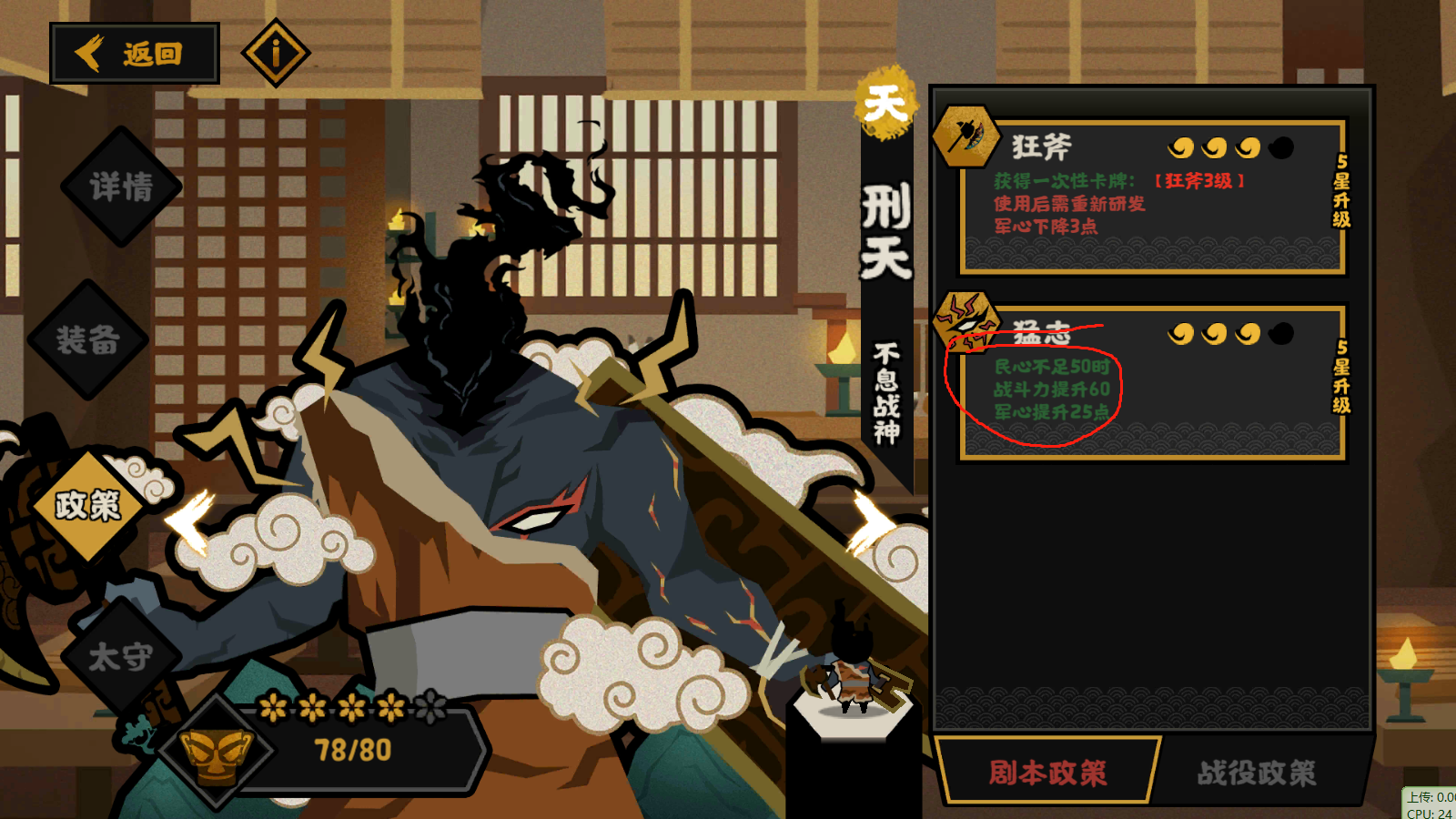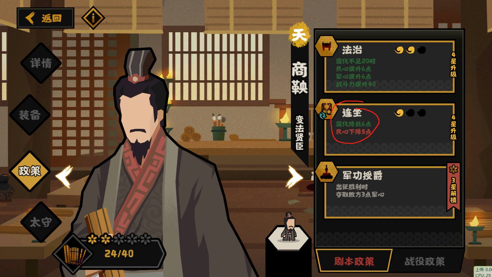 2.刑天2技能,巴青2技能,商鞅2技能,民生减民心的政策。开局,军事三个技能,直接拉到2.6w规模300战力,就可以横推了。