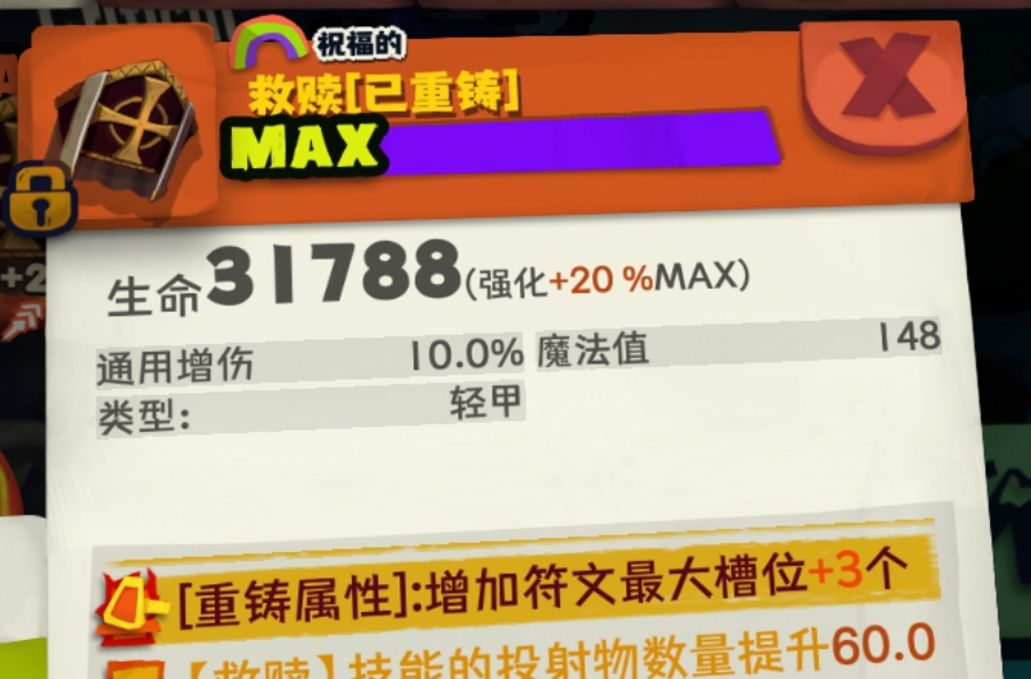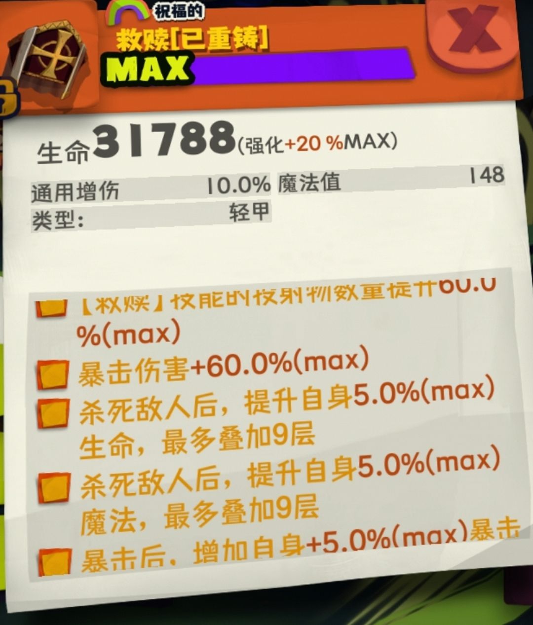 头符文: 投射物数量*2、投射物距离*2、暴击*2(可能有人会问为什么不选择爆伤呢?答: 因为词条有限,词条的爆伤比符文多,所以不会在符文区选择爆伤,只要在词条区选爆伤就可以了,所以这里的符文为了触发起始暴击放的