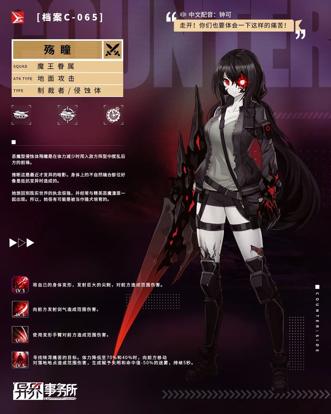 全新SSR觉醒角色“潼恩”将于本周四更新维护后实装,角色专属的秘密雇佣UP卡池同步开放。潼恩是特别擅长使用范围减益效果弱化敌方战斗力的突击队员,她利用死亡敌人的尸体重新组合的产物,会向周围散发恐怖和无力感。
