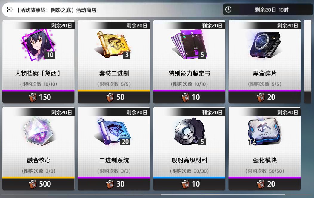 成功挑战ACT.3以及ACT.4的关卡后,将得到随机掉落的道具“无主的酒壶”。老板可使用一定数量的该道具,在更新后的活动商店内兑换到包括人物档案【黛西】(即黛西碎片)、融合核心、套装二进制、二进制系统、特别能力鉴定书、舰船高级材料等作战资源。