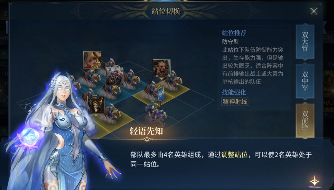 双前锋:此站位下队伍防御能力突出,生存能力强,但是输出较为匮乏,适合阵容中有前排输出战士或大营为单核输出的队伍。