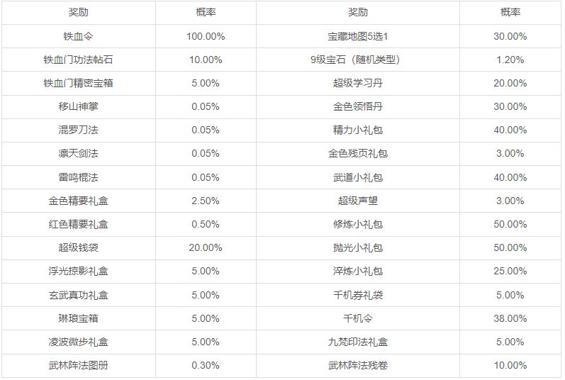 3、每次开启铁血秘宝必得【铁血令】,同时获得4件奖励;