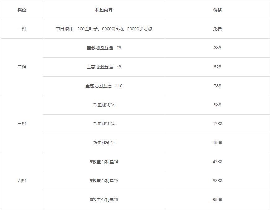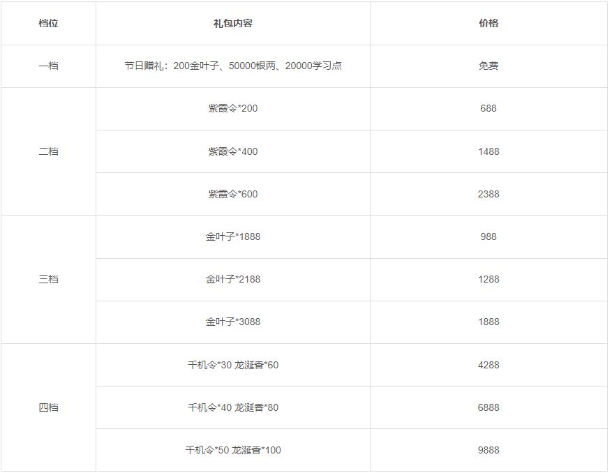 活动一:活动期间将限时上架节日礼包,礼包内容如下: