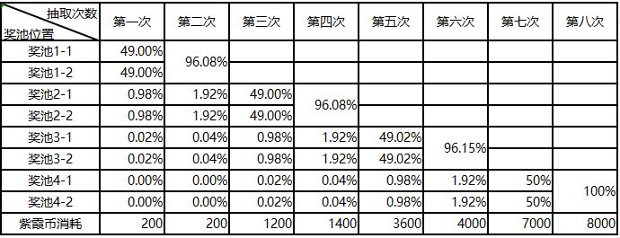 *【概率说明】:此表为默认每次抽到最高概率道具时的概率,如若第一次抽到奖池2-1道具,因抽奖获得道具将不再重复获得,则第二次实际抽奖概率与图中描述第二次概率不同,抽到高奖池道具概率会相应提高。