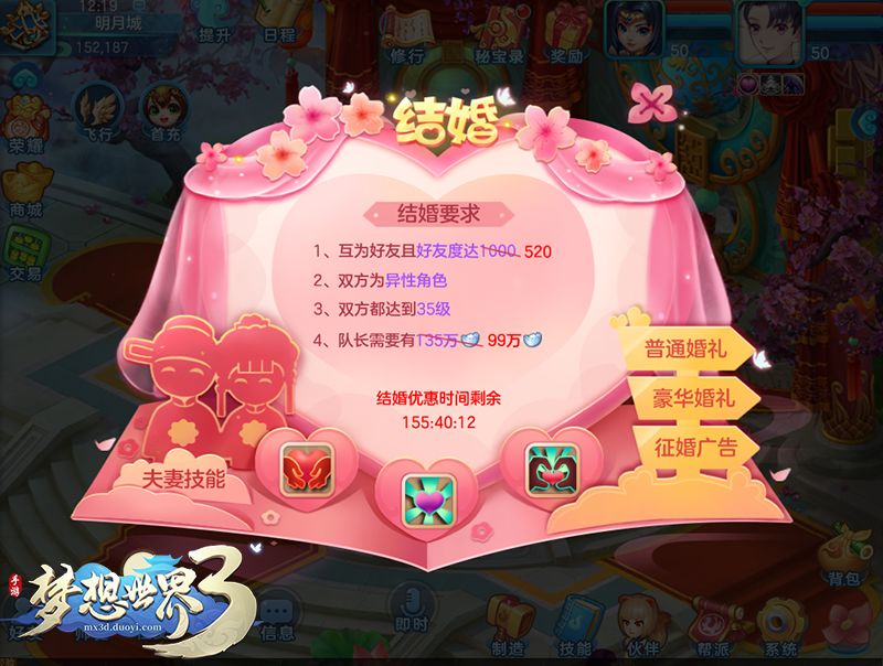 5月19日维护后-5月25日24:00期间,结婚费用限时优惠,互为好友且好友度达到520即可结为夫妻,在活动期间进行结婚更可获得嘉宾的祝福,已深深坠入爱河的各位情侣们千万不要错过!
