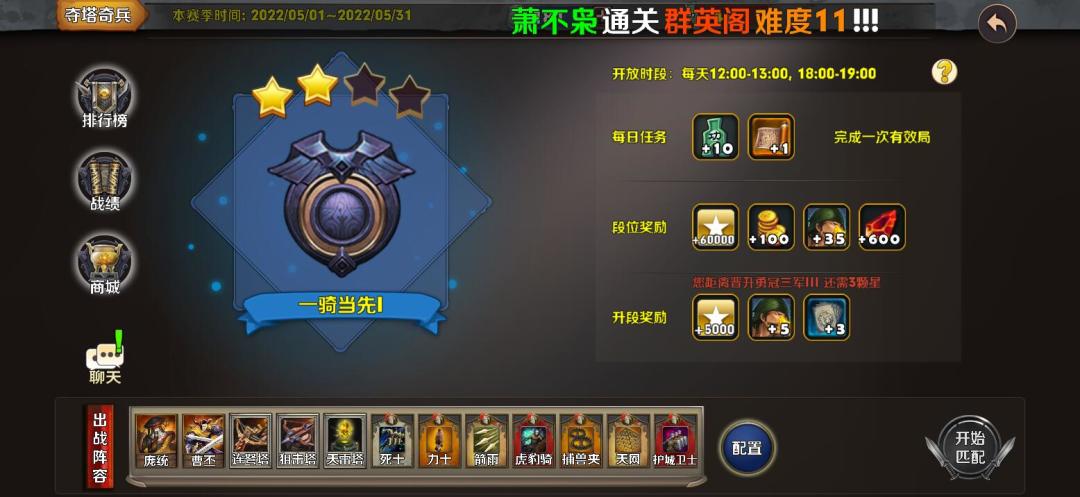 1、夺塔奇兵共分为16个段位,分别为:无名小将III、无名小将II、无名小将I、一骑当先III、一骑当先II、一骑当先I、勇冠三军III、勇冠三军II、勇冠三军I、威震八方III、威震八方II、威震八方I、横扫千军III、横扫千军II、横扫千军I、天下无双。