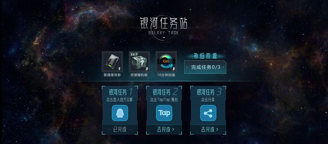 完成“加入官方Q群”、“TapTap预约”、“分享活动至微博或QQ空间”即可领取【补给资源】奖励。