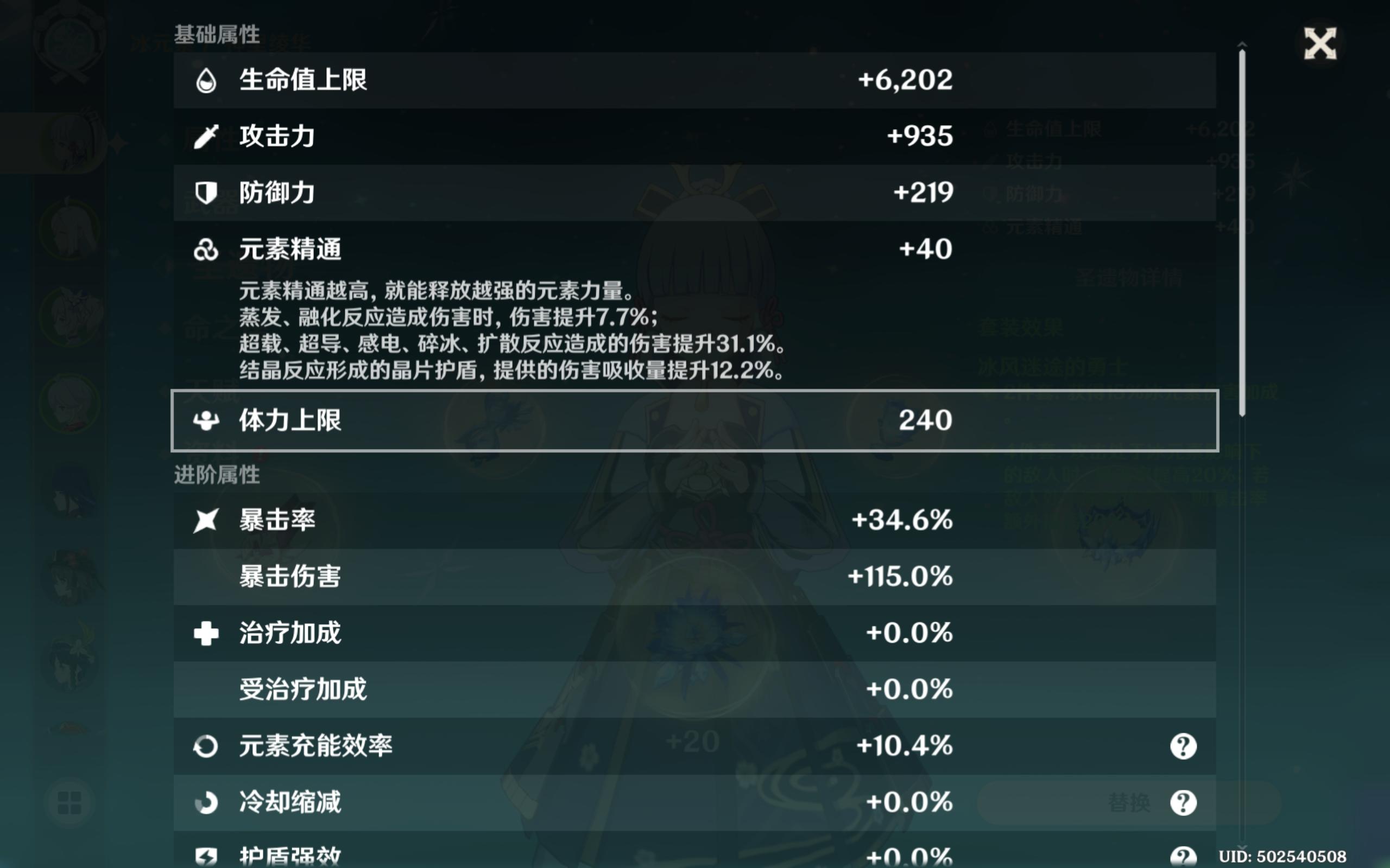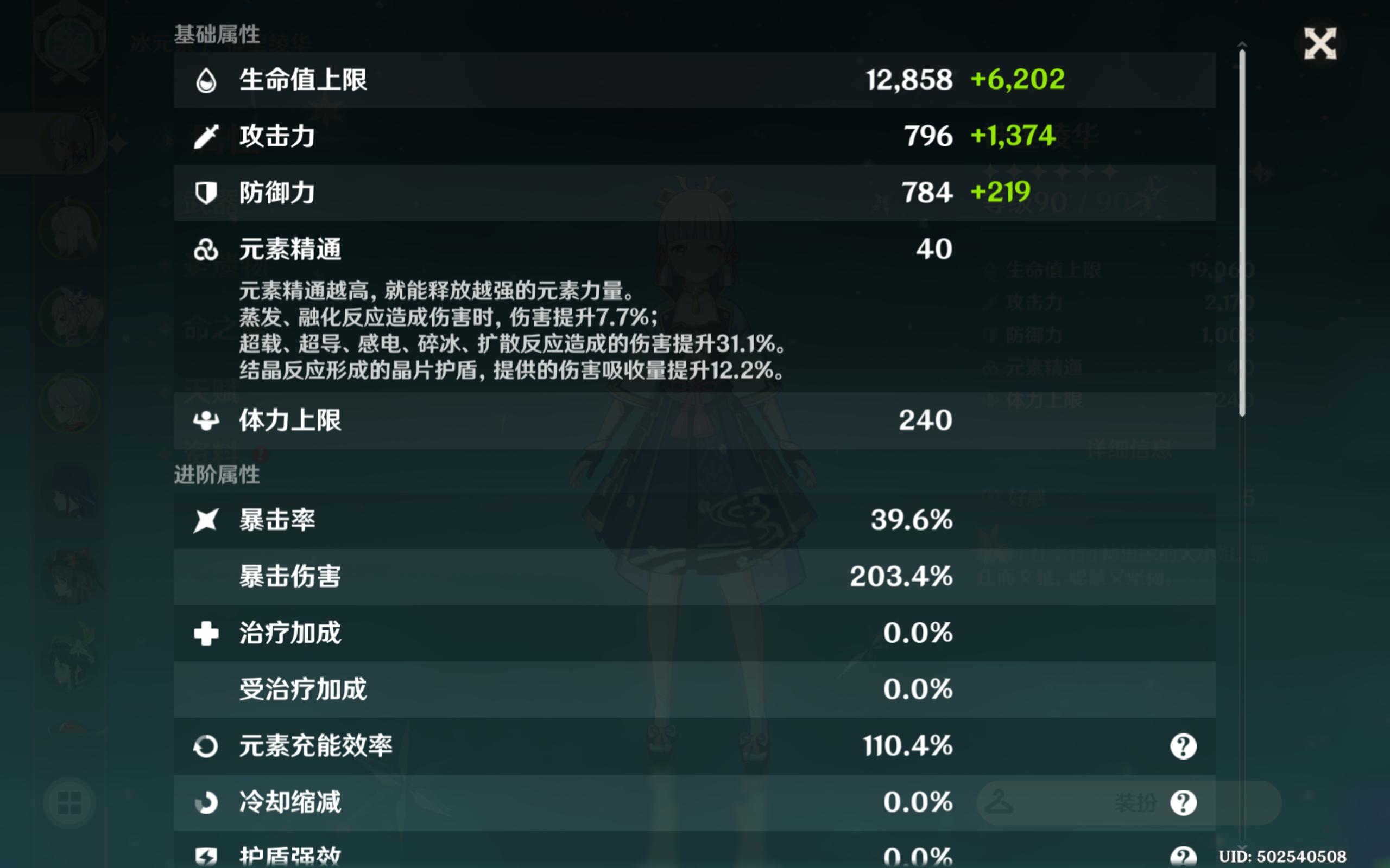 面板数值是攻击2170,暴击率39.6%,爆伤203.4%,精五天目影打刀,4冰,冰伤杯,现在这培养度怎么样了😉