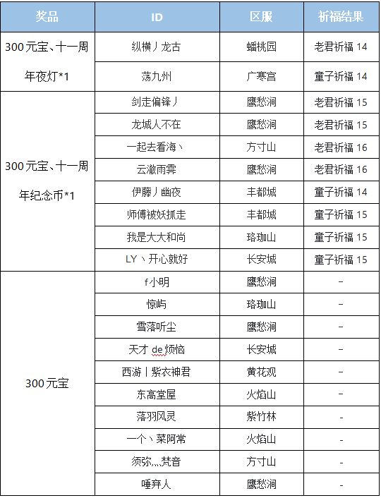 童子祈福十连累计获得道具数量最少的1位上仙可获得【元宝*300、造梦十一周年夜灯*1】