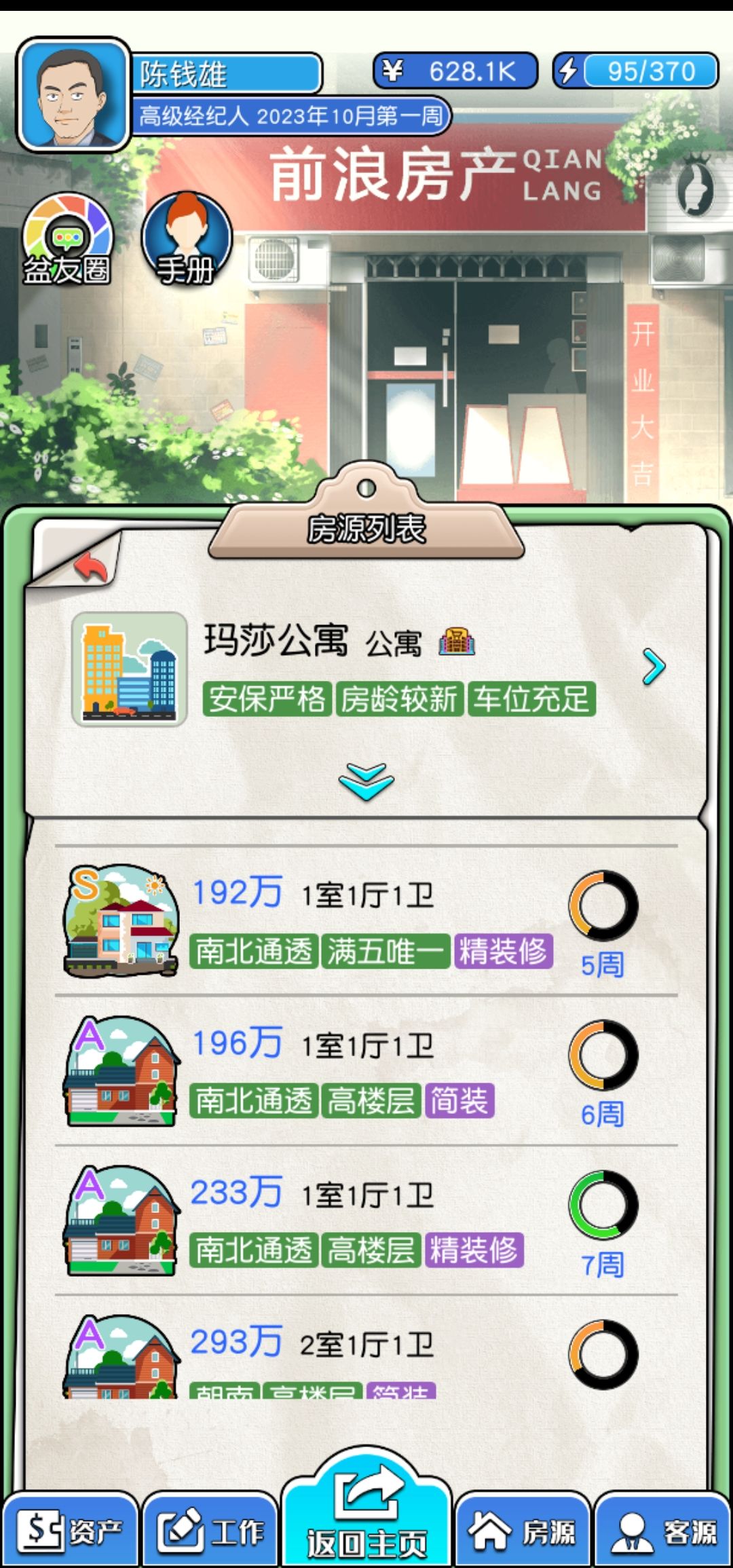 第一,首先要学会solo,就是谈崩之前退出重进!第二,多屯A级房子,个S级房子,因为这类房子大毛病不多,符合销售顾客绝大多数消费者,第三:记住看房子挂牌时间,马上到了就花1千元签独家代理,这样能延续8周时间,省很多体力,并且,屯房子,为后期开端口,69异地,和各端口成相符作用,后续就不用自己找顾客了,第四体力,用在刀刃上将大部分体力用在开放度上,这样每周系统都会给你新房子,这里建议开发度在90以上,s级房子A级房子大概率出,第五,赚钱了,记得买经纪人必备物品,对于谈判有奇效,带看也是如此,第六:顾客:不是所有顾客都是你攻略对象,你前期主攻一房,还是二房,还是三房以上!你必须专精其中一个,屯其中一个,大量A房和S房!如果不是你专精的顾客,10体力你就知道是否你专精房子顾客,不是就转手其他经纪人,懂得分享,及时止损,!我发了这么多字,不给赞,怎么行,攻略1万赞在给你说说怎么谈判效率高! ……………………………………………………………………………………………………………如何不用看广告就能进入下个月的教程,当然开发者也要养家糊口,才能做出更好的游戏,大家要多多支持呦 - TapTap